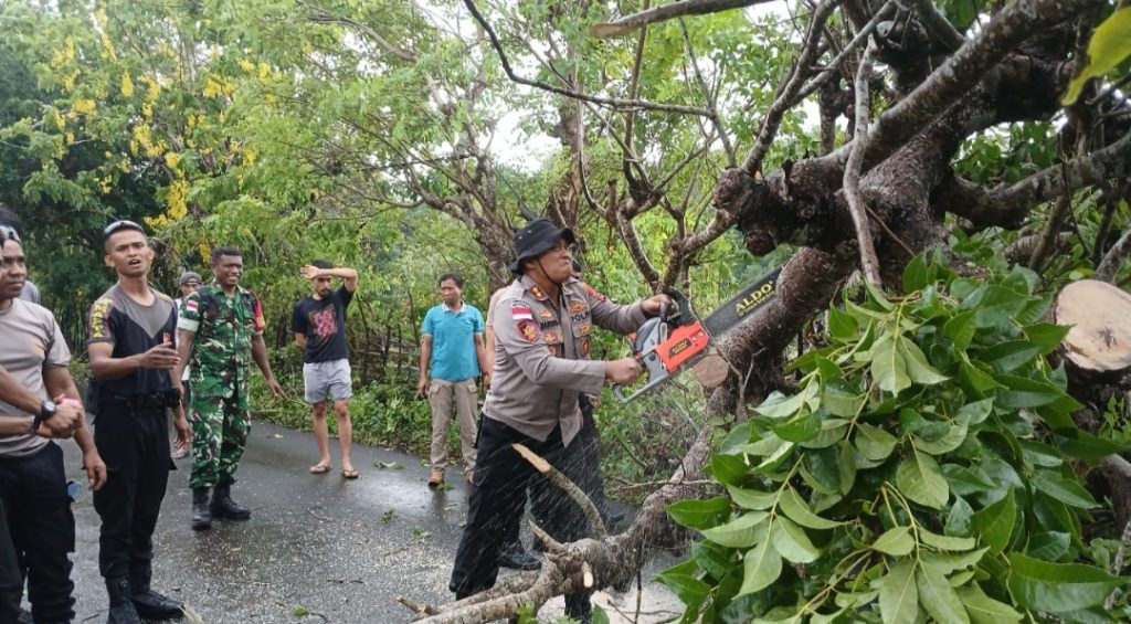 Atas informasi dari masyarakat Personel Polres Rote Ndao yang dipimpin langsung oleh Kapolres Rote Ndao AKBP Mardiono.,S.ST.,M.K.P bersama Kasat Samapta Polres Rote Ndao Iptu Yohn F Kotta tiba dilokasi membawa peralatan yang diperlukan untuk melakukan evakuasi material pohon tumbang tersebut.