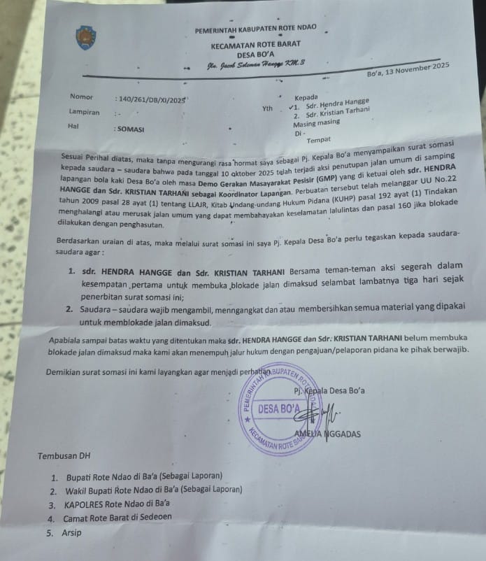 Rote Ndao- SUARANKRI.COM-Pemerintah desa (Pemdes) Bo,a melayangkan somasi atau memberikan peringatan hukum kepada pihak-pihak yang melakukan blokade jalan, terutama jika jalan yang diblokade merupakan akses masuk ke PT. Bo,a Development. Tindakan blokade jalan tersebut tanpa izin melanggar hukum dan dapat mengganggu fungsi jalan serta kelancaran lalu lintas.