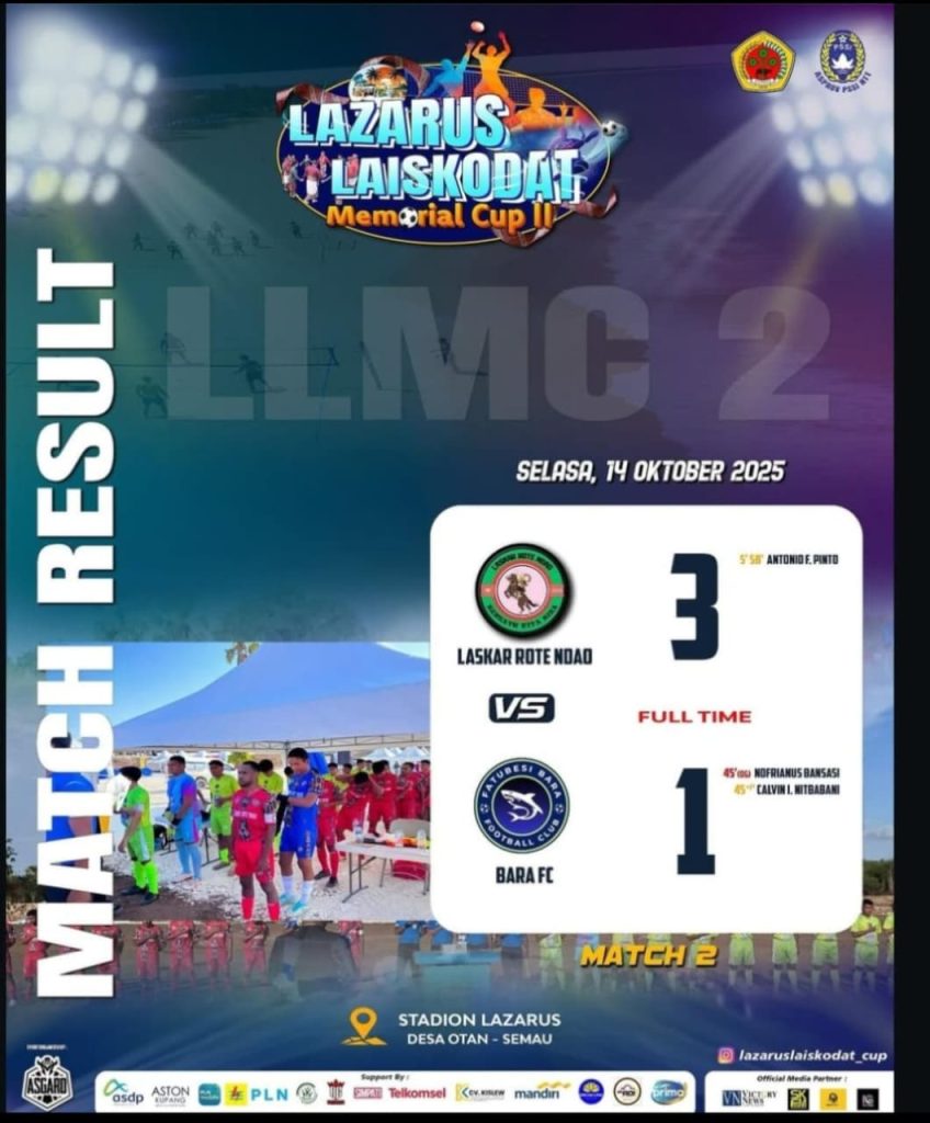 Rote Ndao – SUARANKRI.COM-Duel Laskar Rote Ndao vs Bara FC pada laga ternamen sepak bola Lazarus Laiskodat Cup ll yang berlangsung di Stadion Uitio Semau pada Selasa 14/10/25, tim Laskar Rote Ndao yang berjulukan Bumi Ti,i Langga tampil sangat ciamik kendati membuat lawan kewalahan.